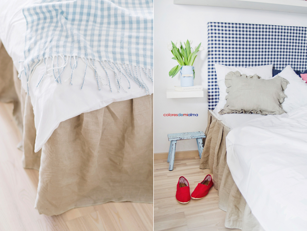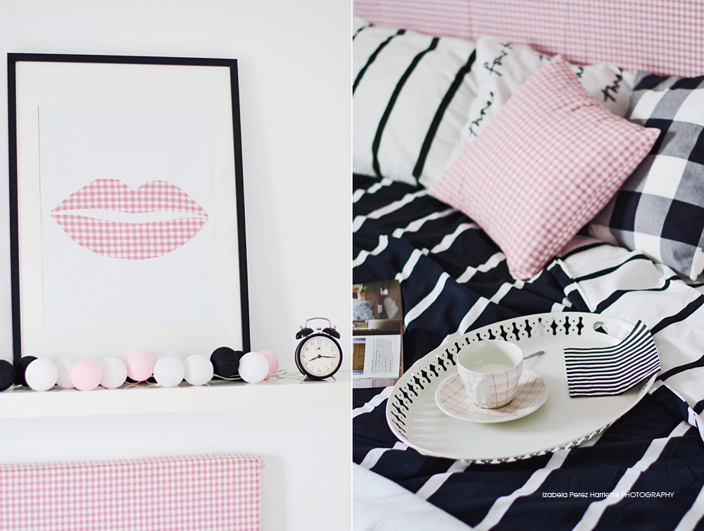Jakiś czas temu zmieniłam wzór i kolor zagłówka na granatową kratkę. Mam jeszcze dwie inne wersje zagłówka, które kiedyś Wam pokażę :D. Zobaczcie jak mała zmiana potrafi zmienić wnętrze.